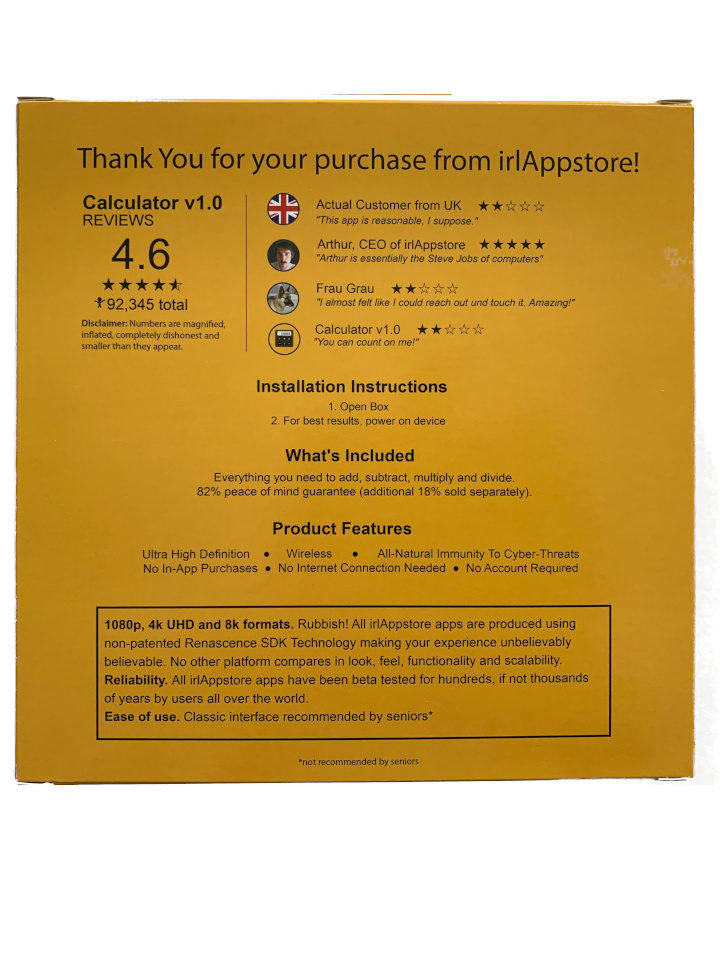 The department received complaints from several consumer watchdog groups regarding the alleged "division" feature, it seems to be improperly handled by your software and was overlooked by quality assurance. Warning, technical jargon follows. To reproduce the issue, enter the following equation: "1 ÷ 0 =", which returns "Not a Number". This is an obvious violation of the federal No Numbers Left Behind Act of 2003, in which all numbers are to be treated equally. You can either conform or be destroyed.