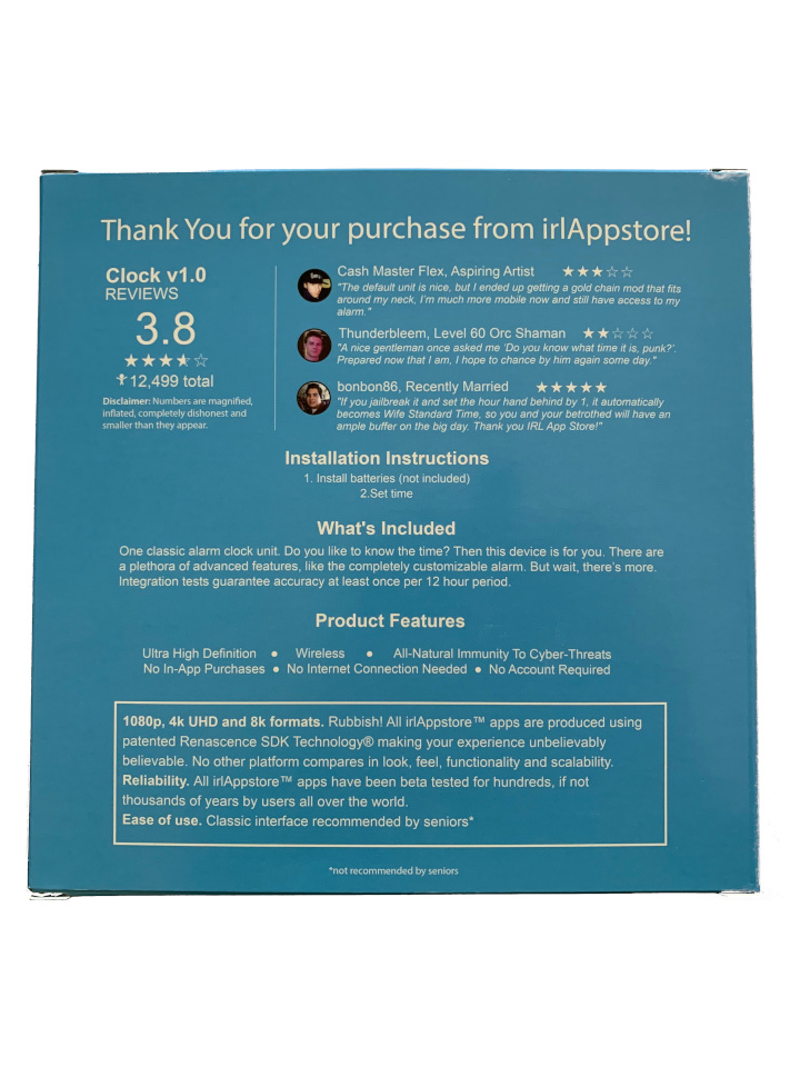 A reimagining of a classic horological instrument. Actually it is just an alarm clock without any modifications. It tells time with reasonable accuracy. Also included is moderately entertaining packaging, so it is well suited as a gift to someone you hold in average regard. Batteries included.