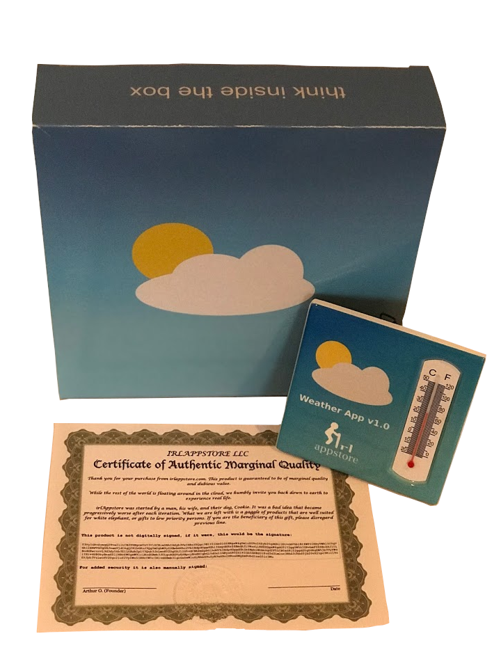 One thermometer and desk stand. This app is shipped in expertly crafted packaging, making it a perfect gift for white elephant or non-essential persons.