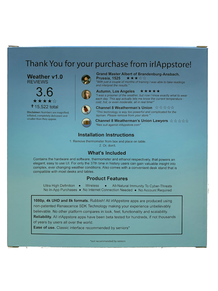 Science has come a long way in the last thousand years culminating in this amazing device. Not only does it tell you the temperature, it also tells you the temperature. So I guess that is all it does. Getting this for my son for his birthday!