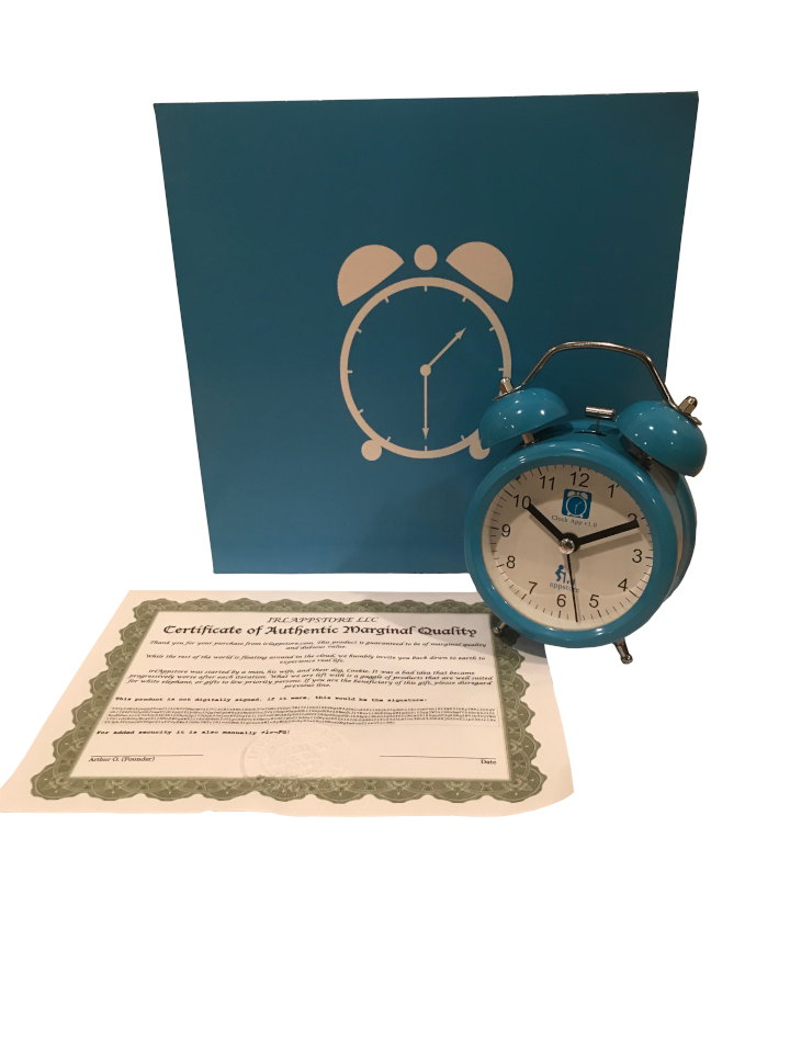 Tells time. Has an alarm. Patented technology guarantees accuracy no less than once per 12 hour cycle.