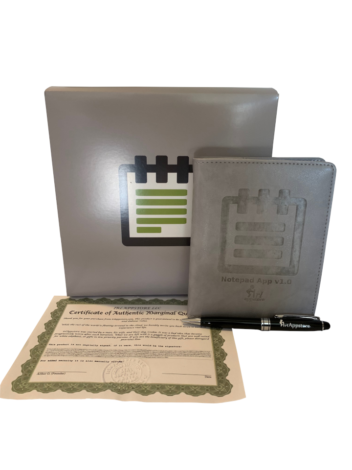 One A6 sized (4.1 x 5.8 in) leather bound, 80 page notebook with carbon copy duplicates so your information is secure and durable. Also included is one stylus compatible with this app. The packaging is scientifically proven to make you laugh, not out loud of course, so more of a hrmpph.